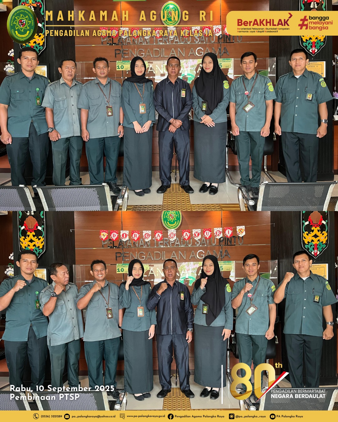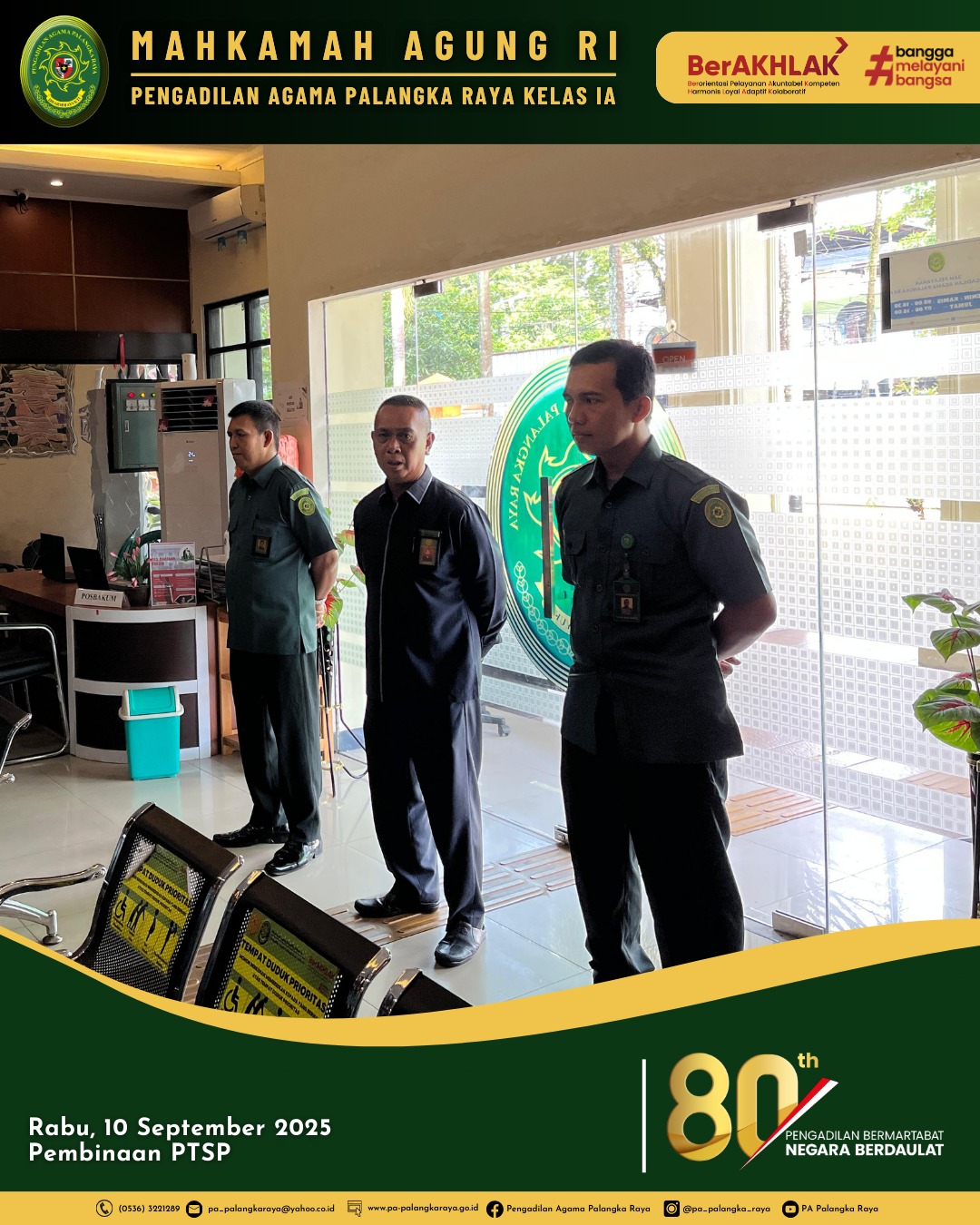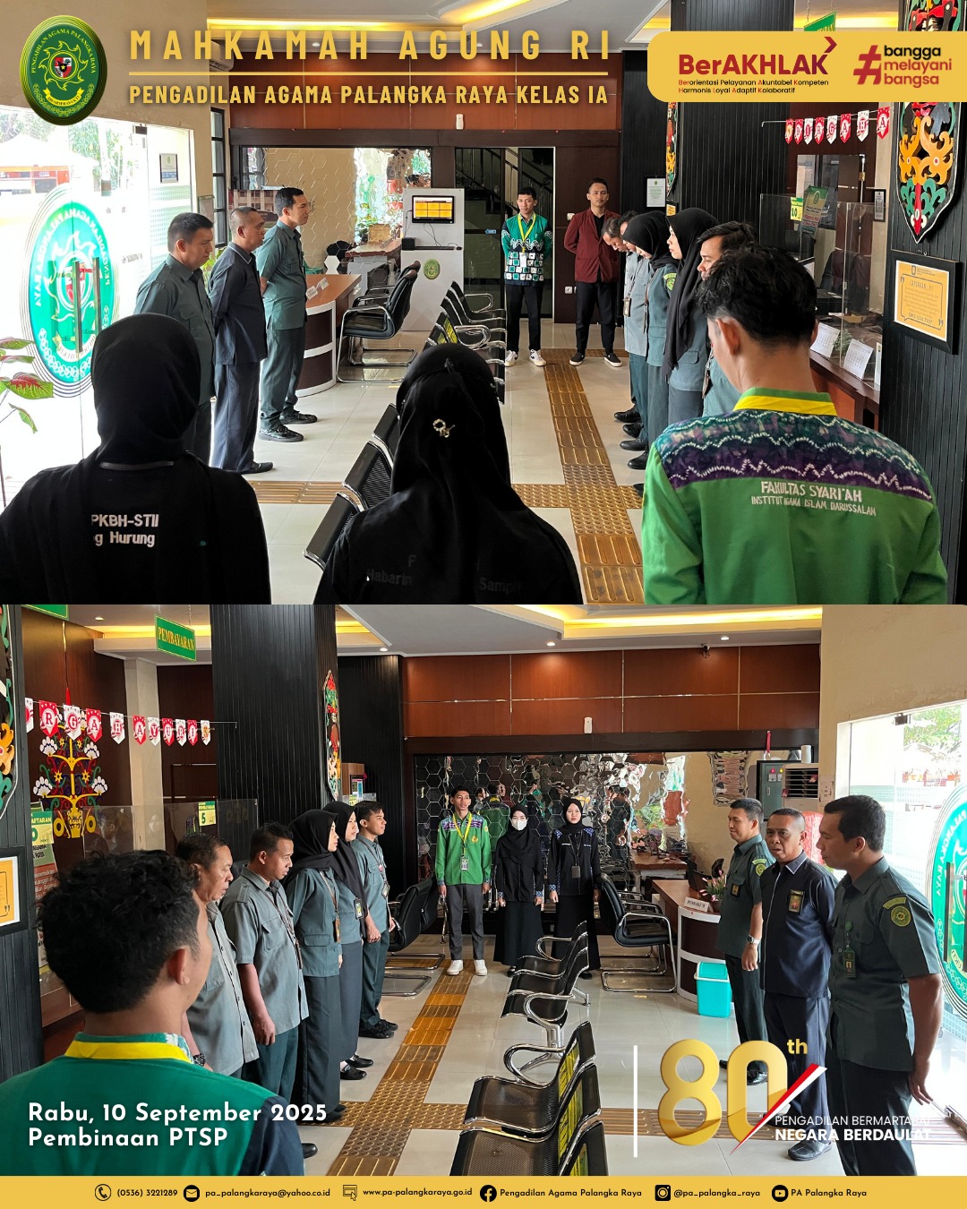 Briefing pagi yang rutin dilakukan setiap rabu pagi kepada petugas layanan PTSL Pengadilan Agama Palangka Raya adalah bagian dari upaya meningkatkan kualitas layanan kepada Masyarakat. Kegiatan ini berlangsung di ruang pelayanan PTSL tepat pada pukul 08.00 WIB. Diikuti oleh seluruh petugas layanan yang terdiri dari security, petugas piket dan petugas meja Pelayanan Terpadu Satu Loket (PTSL). (10/09/2025).