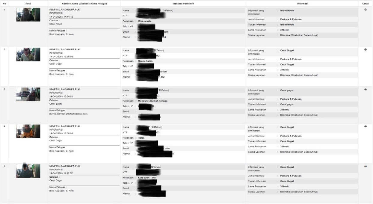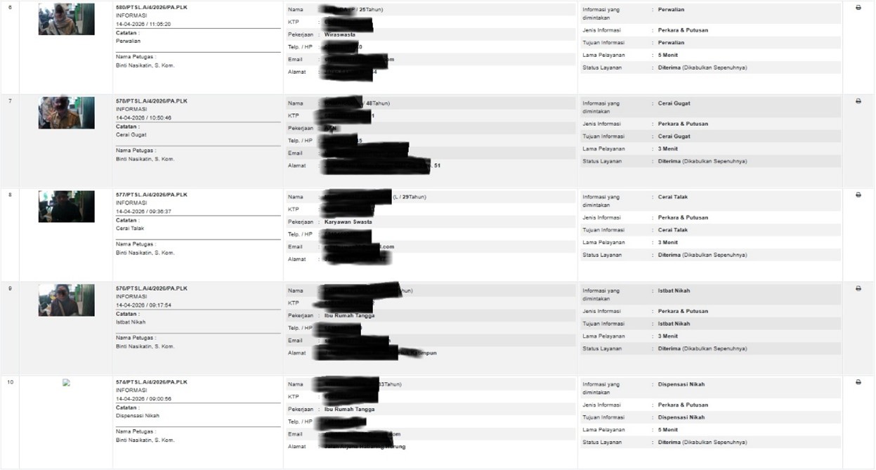 PALANGKA RAYA – 14 April 2026 Aktivitas pelayanan publik di Pengadilan Agama Palangka Raya kembali berjalan dengan lancar. Berdasarkan pembaruan layanan informasi harian, tercatat sebanyak sepuluh (10) orang pengunjung datang untuk memanfaatkan layanan di Meja Informasi Pelayanan Terpadu Satu Pintu (PTSP).