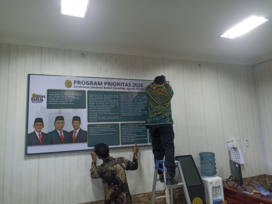 PALANGKA RAYA – Suasana penuh semangat terlihat di Pengadilan Agama Palangka Raya saat beberapa pegawai bergotong royong memasang banner Program Prioritas Badan Peradilan Agama Tahun 2026. Kegiatan ini menjadi simbol dimulainya implementasi arah kebijakan terbaru dalam meningkatkan kualitas pelayanan kepada masyarakat.